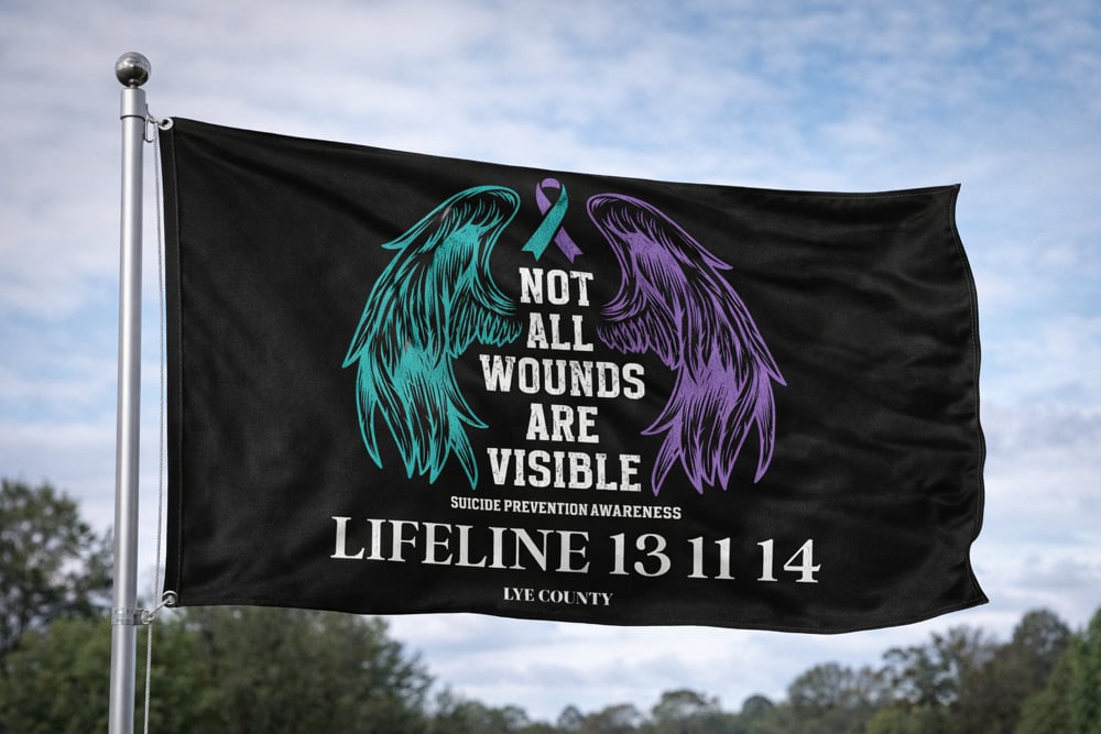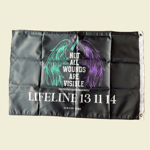 Featuring angel wings in green and purple—colours of suicide awareness—and the powerful message “Not All Wounds Are Visible”, this flag also displays the Lifeline crisis support number: 13 11 14.